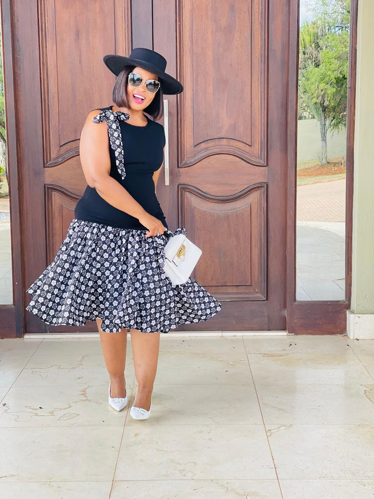 D17.2 - Fit & Flare with Asymmetric skirt (Black bodice with Black & white African print skirt)